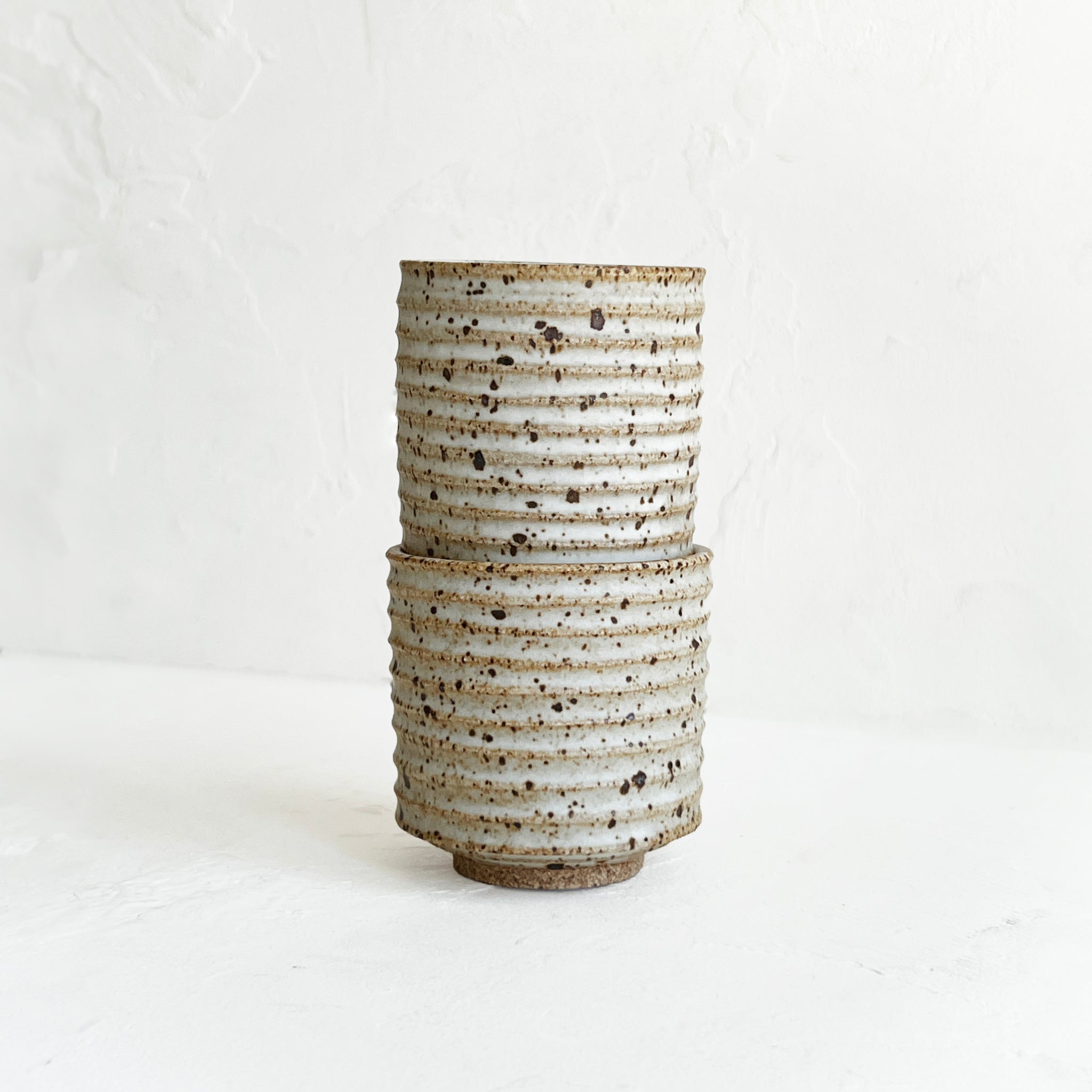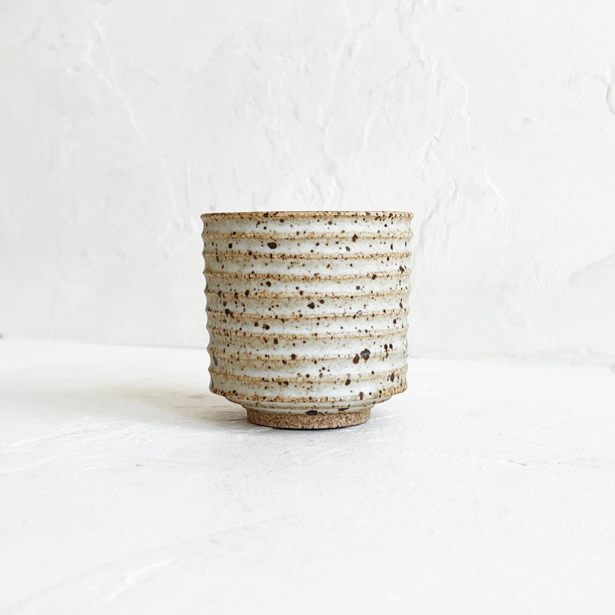 Our wheel-thrown sipping cup is perfect for cortados, espresso, tea, and even wine. It features a ribbed texture with slight variations in each piece, making every cup uniquely imperfect.