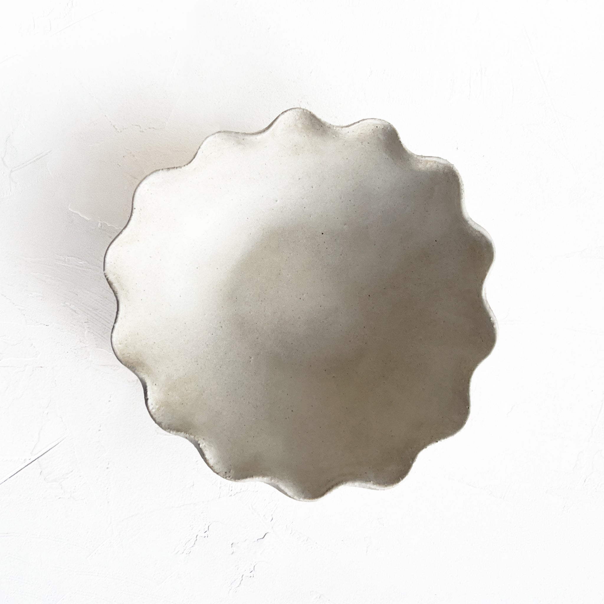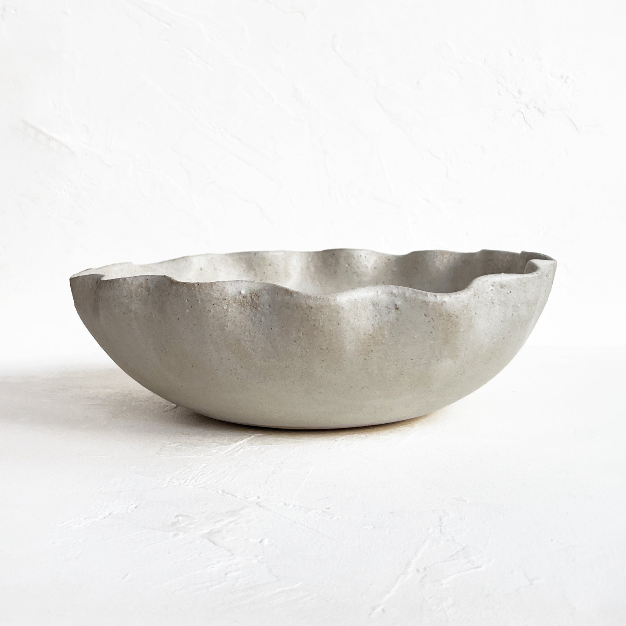 This large, handcrafted vessel in a matte cream. It is designed for practical use, is food safe, and sturdy enough for everyday use, but should be treated with care. The inside is glazed, allowing it to hold water; however, due to the semi-porous nature of the stoneware, you may notice some sweating or condensation on the bottom of the piece.