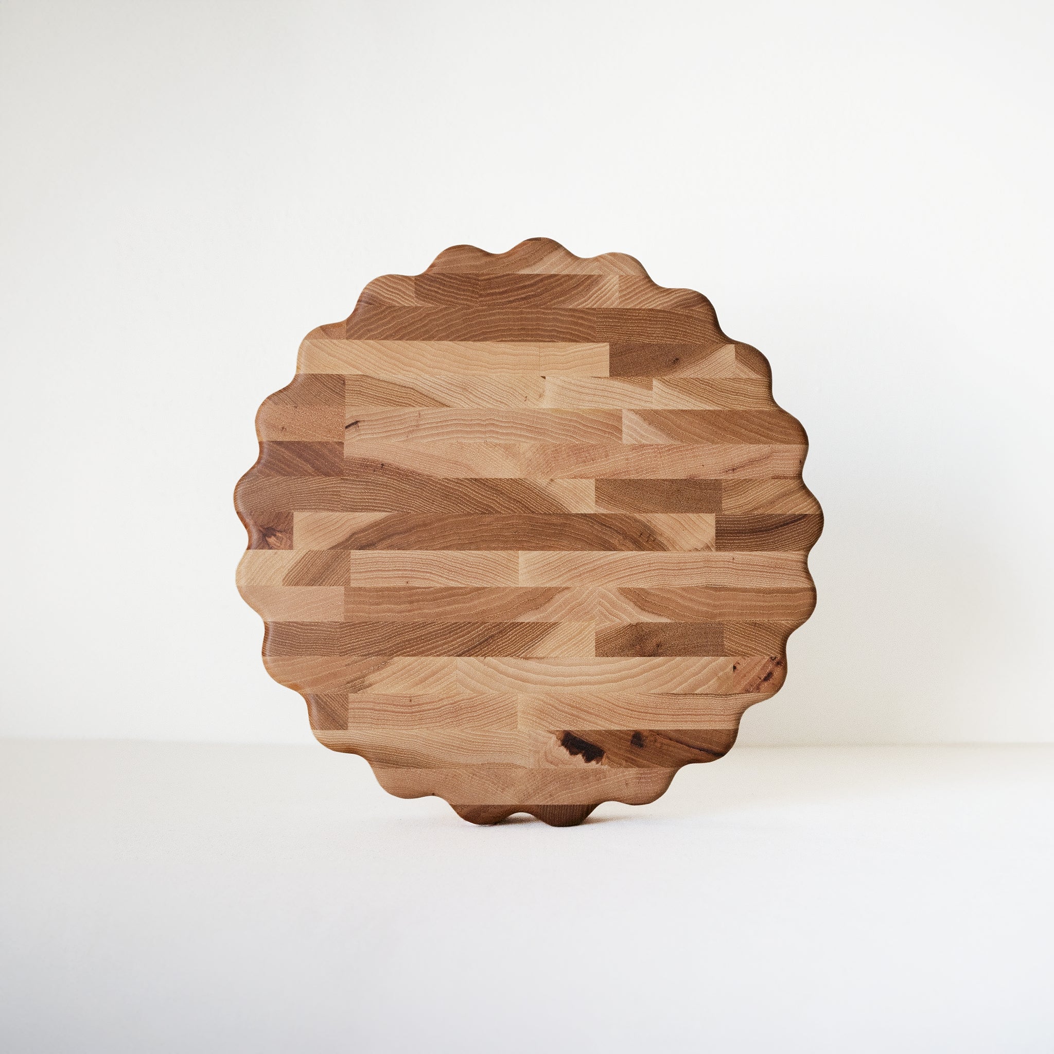Solid dark hickory butcher block with a charming scalloped edge, finished with food-grade oil & wax.  Caring for this cutting board is easy—hand-wash with mild soap and water and periodically treat it with food-grade mineral oil to maintain its natural luster and longevity.